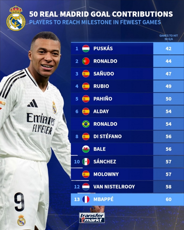 8月21日,德国转会市场公布了一项关于皇马球员达成50个进球贡献所用场次的数据统计。榜单显示,传奇球星普斯卡什仅用42场比赛便达成这一成就,位列第一,C罗以44场紧随其后。现役球星姆巴佩以60场的成绩排名第13位。